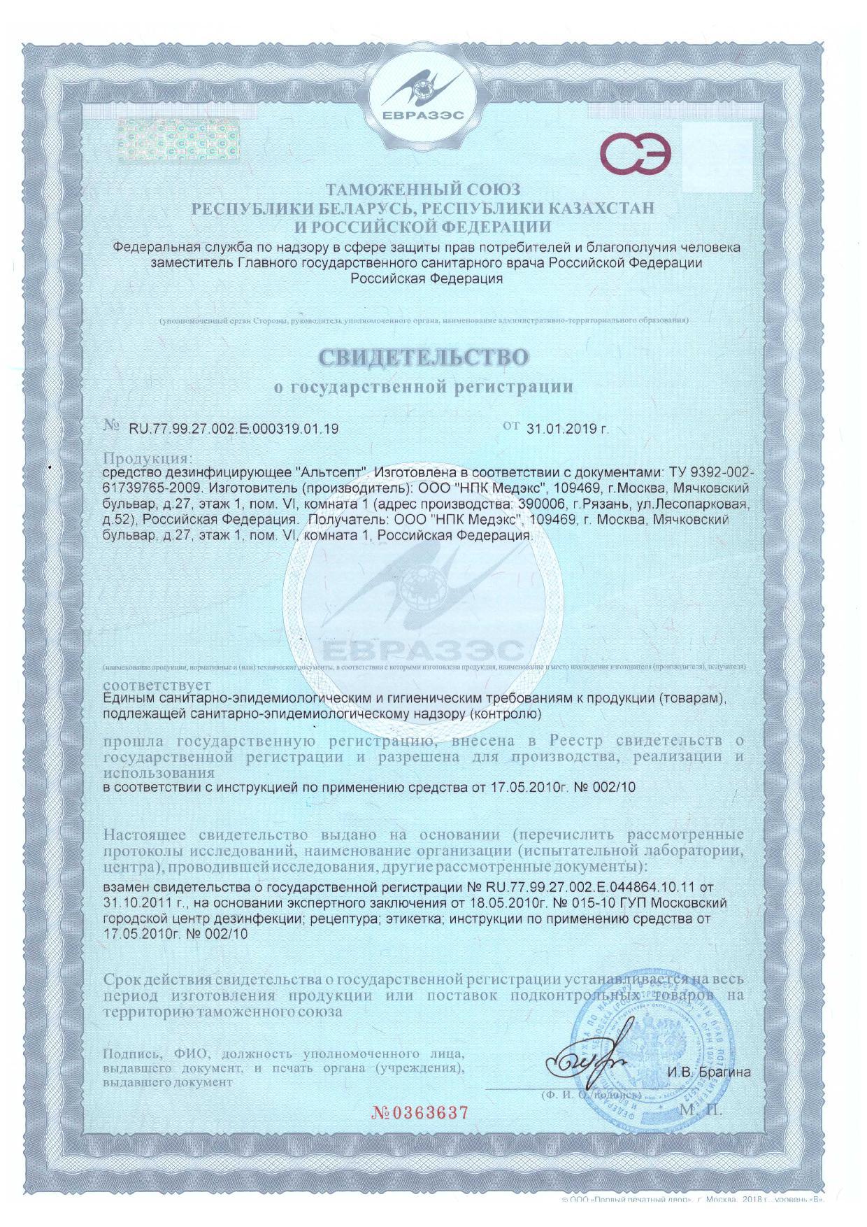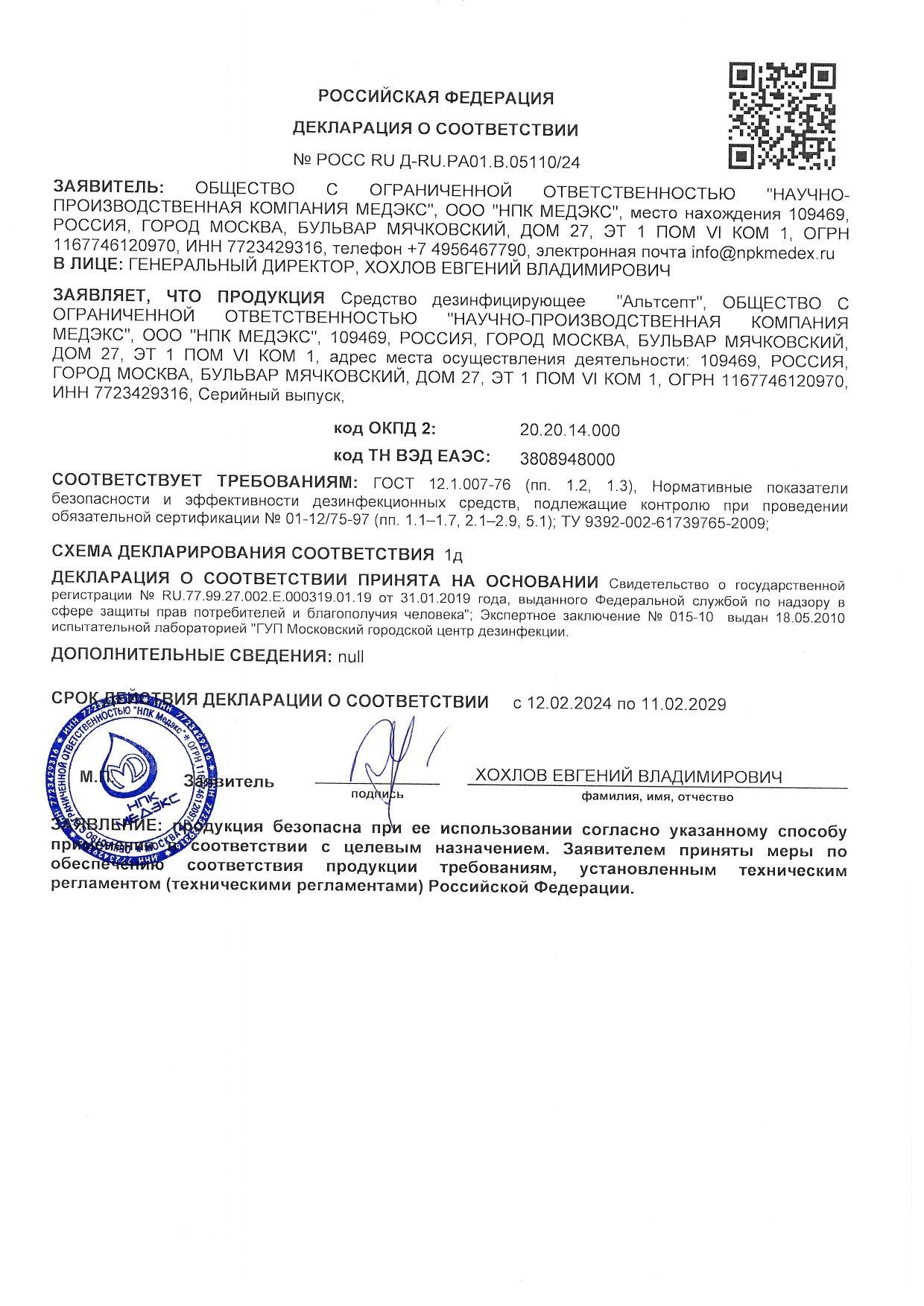 Средство обладает антимикробной активностью в отношении грамположительных, включая возбудителей туберкулеза (тестировано на Mycobacterium terrae) и грамотрицательных (кишечная палочка, синегнойная палочка) бактерий, противовирусной активностью (в отношении возбудителей ECHO 6 (группа вирусов полиомиелита) и фунгицидной активностью. - Назначение, область применения:
