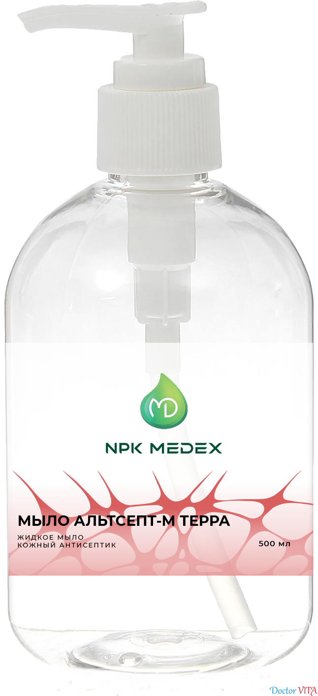 Альтсепт-М Терра медицинское жидкое мыло антибактериальное - готовый к применению раствор, обладает пробладает антимикробной активностью. Прозрачная жидкость, pH 7,0±1,5.