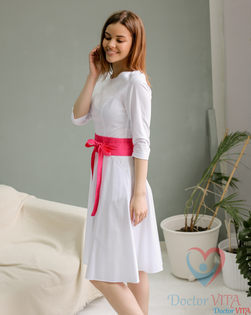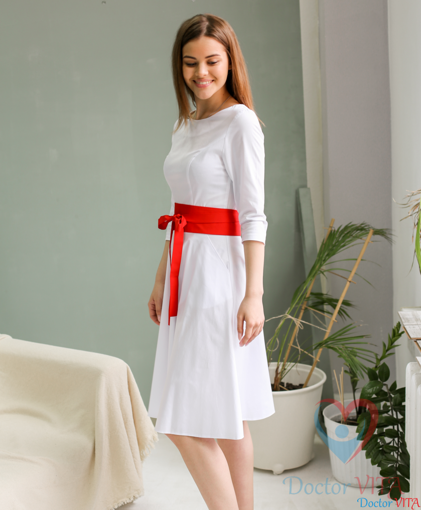 Платье DOCLIKE DL315 белого цвета нежное, легкое, выполненное из комфортной ткани с эффектом стрейч, юбка солнце, рукав ¾, имеет боковые карманы. Дополнено широким поясом, подчеркивающим талию, представленным в ярких цветах на выбор: голубой, сиреневый, фуксия, яблочный, красный, бордовый и синий. Подходит на фигуру «груша» - с широкими бедрами и узкой талией.