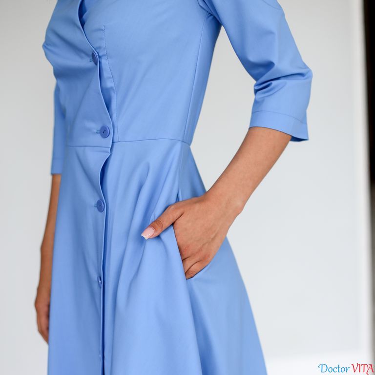 Платье на запахе на пуговицах. Приталенное с расклешенной струящейся юбкой. Имеет боковые карманы. Подобное платье – приталенное и с узким рукавом. Расклещеная юбка солнце. Рукав 3/4. Подходит на фигуру «груша» - с широкими бедрами и узкой талией.