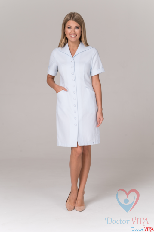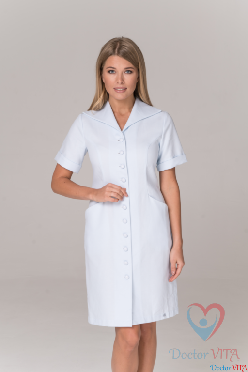 ПЛАТЬЕ медицинское Dr.Super модель "Joy" белого цвета. Приталенное платье на пуговицах с воротником. С двумя карманами спереди и отложными манжетами на рукавах. Модель произведена из высококачественного пике