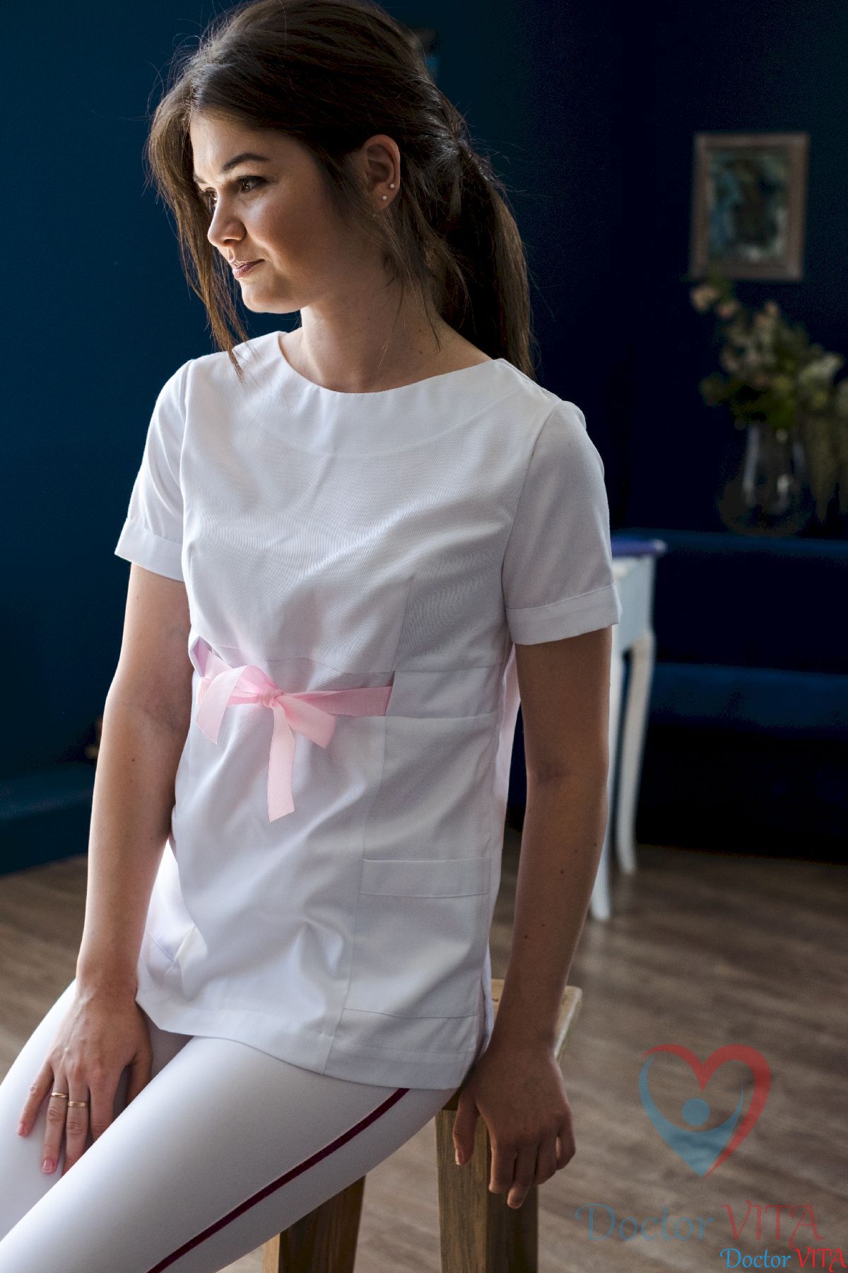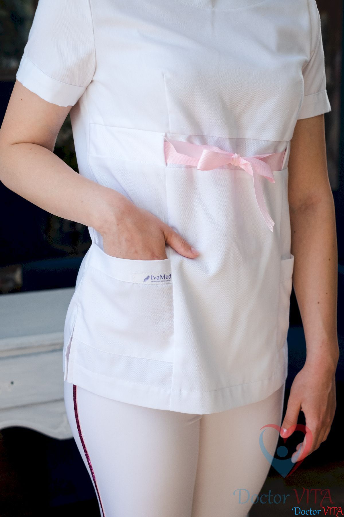 Медицинская для беременных блуза c атласной розовой лентой IvaMed белого цвета для стильных докторов.