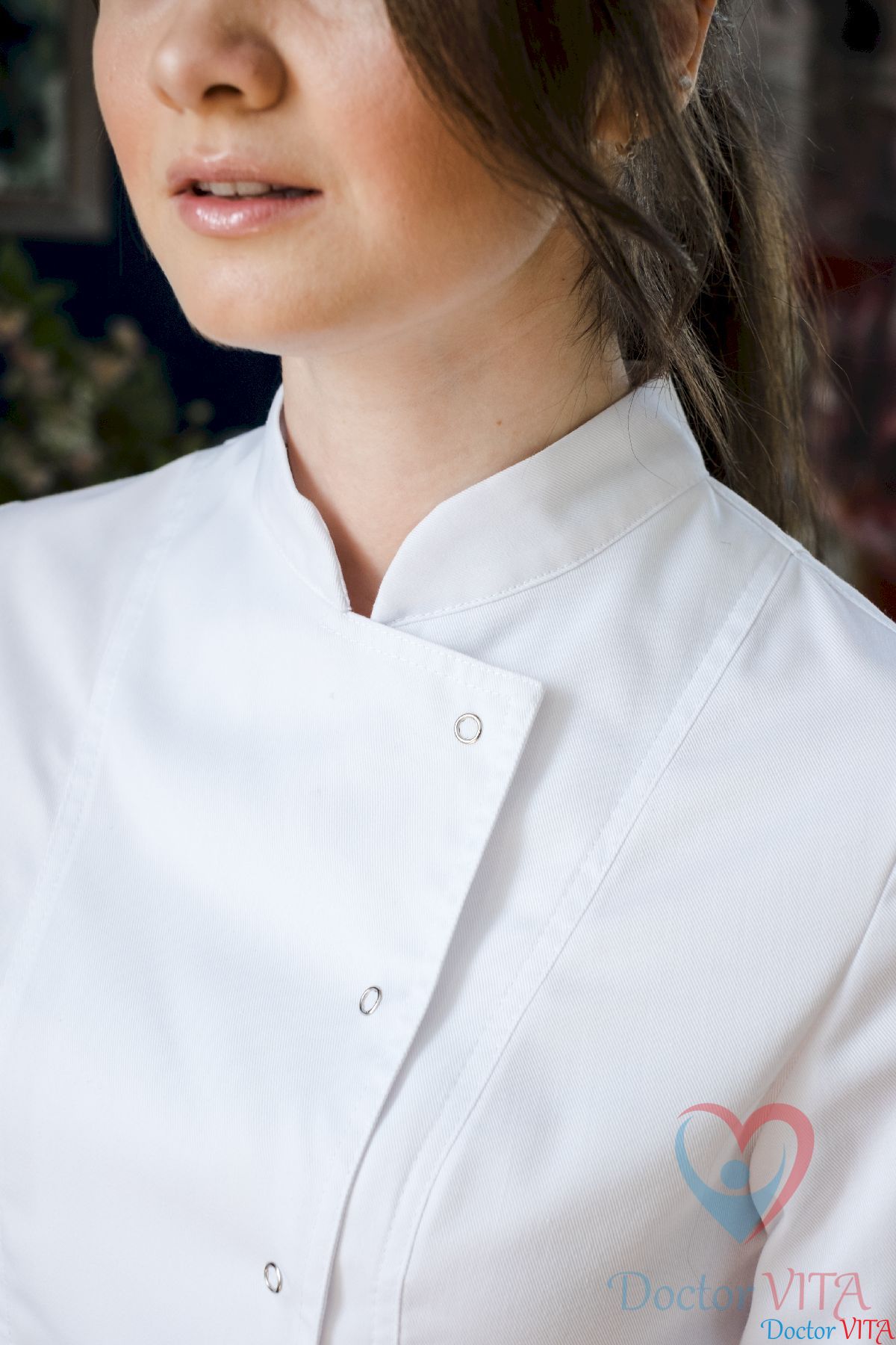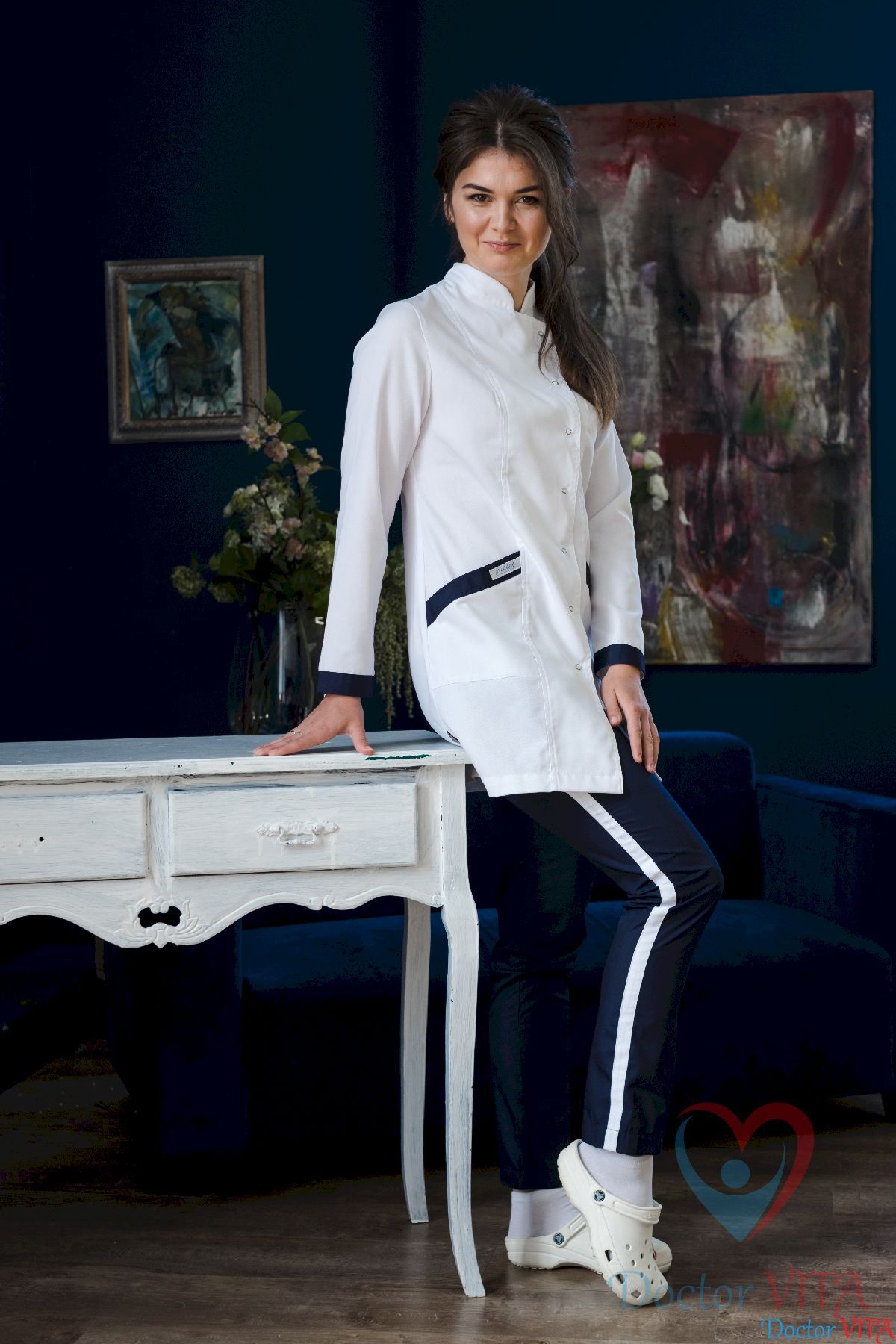 Медицинский удлиненный халат со воротником "стойка" и синей окантовкой IvaMed белого цвета.