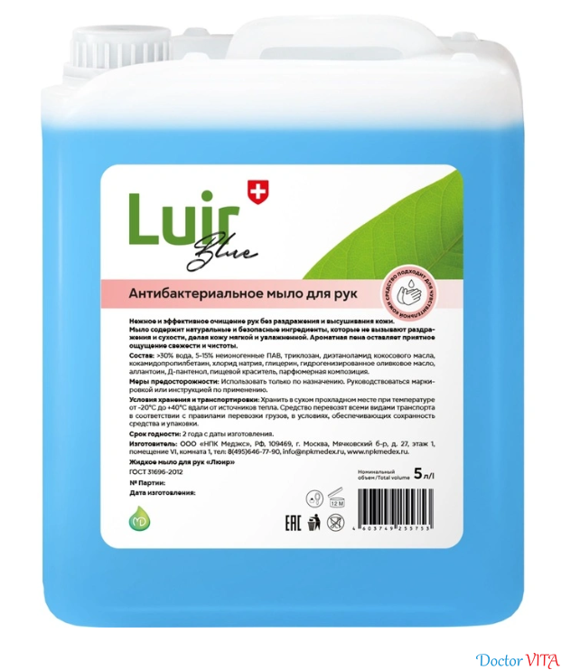Люир мыло жидкое антибактериальное голубое- готовый к применению раствор, обладает пробладает антимикробной активностью. Прозрачная жидкость голубого цвета, pH 6,5.