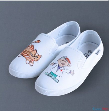 Слипоны — легкая обувь без шнуровки. Состоят из верхней части — парусины и резиновой подошвы. Расписывается вручную дизайнерами. Врачи большую часть времени находятся на ногах, а порой необходимо стоять на одном месте несколько часов. Важно, чтобы обувь была удобна, проста в уходе.